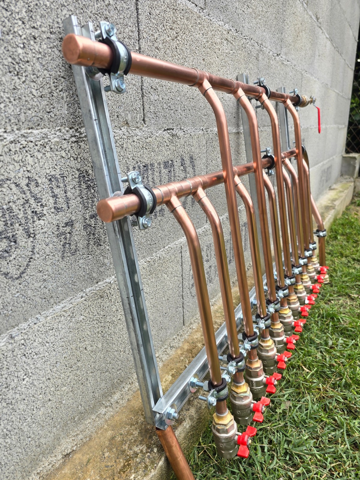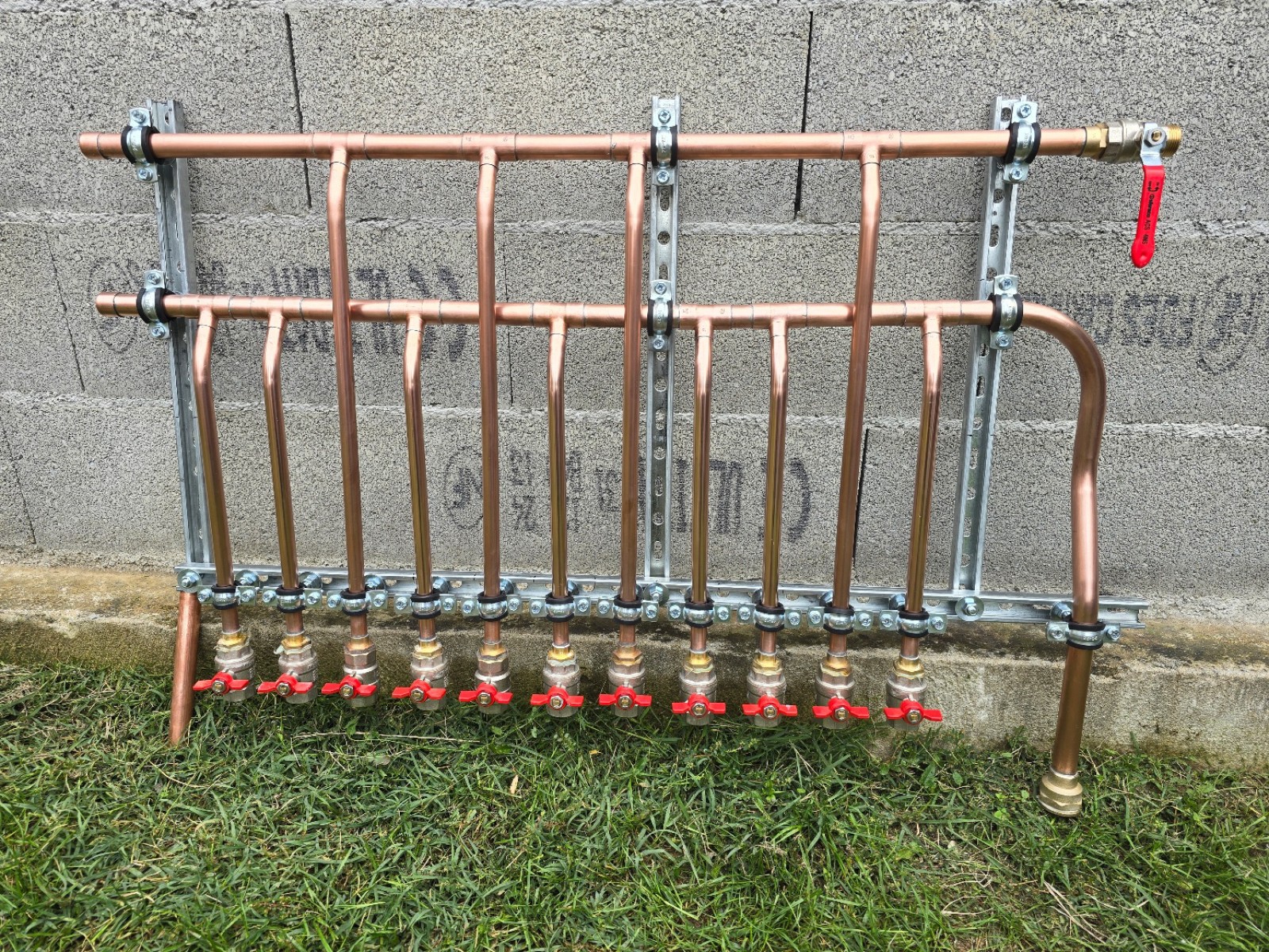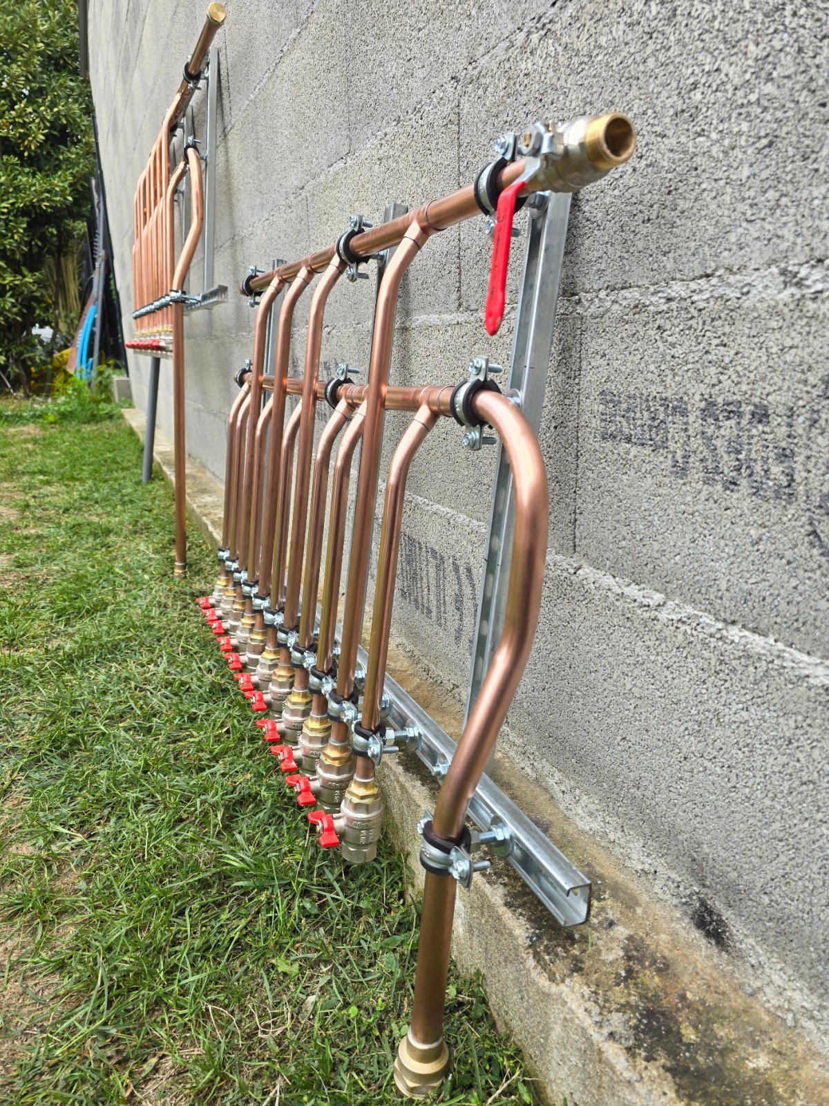 Étant donné le caractère exceptionnel et l'ampleur de la rénovation, nous avons opté pour la fabrication sur-mesure et en cuivre des collecteurs de plomberie pour le rez-de-chaussée et l'étage. La fabrication a été faite dans notre atelier dans le but de n'avoir que l'installation et le raccordement à exécuter sur chantier.