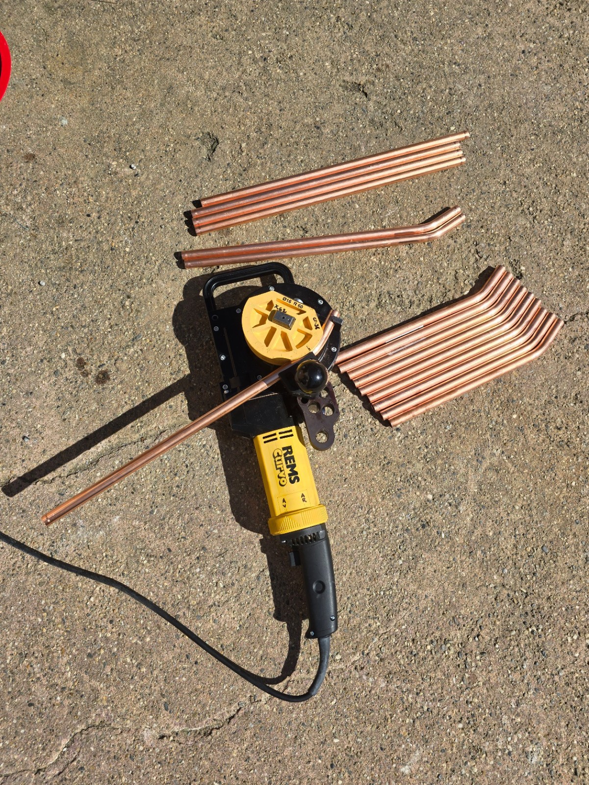 Les collecteurs de plomberie ont été cintrés à froid puis brasés à l'étain afin de préserver le caractère noble du cuivre. Ils ont ensuite été poncés, nettoyés puis vernis.